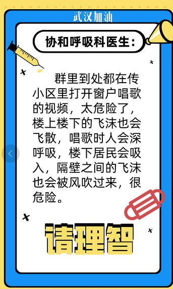 武汉部分小区开窗同声唱歌,齐喊加油,场面感人。安全角度却不可取。唱歌时人会深呼吸,楼上楼下飞沫飞散,增加了风险。疫情严峻,武汉人居家多日,心理减压很有必要。万众一心抗疫,想唱就唱没关系。关起门闭上窗,在家里唱唱就好。只要心里有歌声,何怕别人听不见?